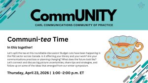 Budget constraints across Canada’s post-secondary sector are shaping the work of academic libraries in significant ways. This Communications Community of Practice Communi-tea roundtable offers an opportunity for members to reflect on how these pressures are affecting communications practices and planning.