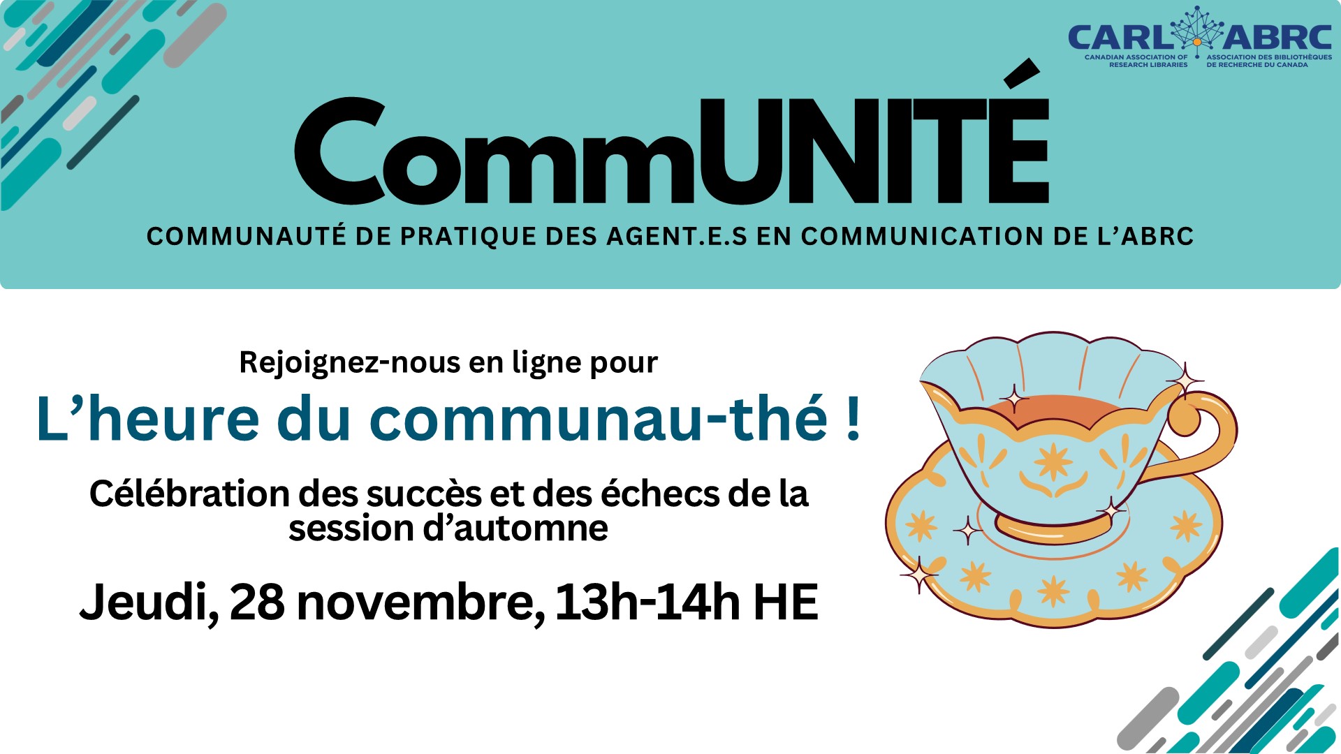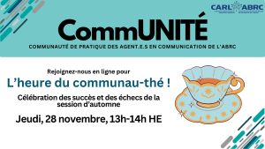 Appel du mois de novembre de la Communauté de pratique des agent.e.s en communication de l’ABRC – L’heure du communau-thé ! Célébration des succès et des échecs de la session d’automne