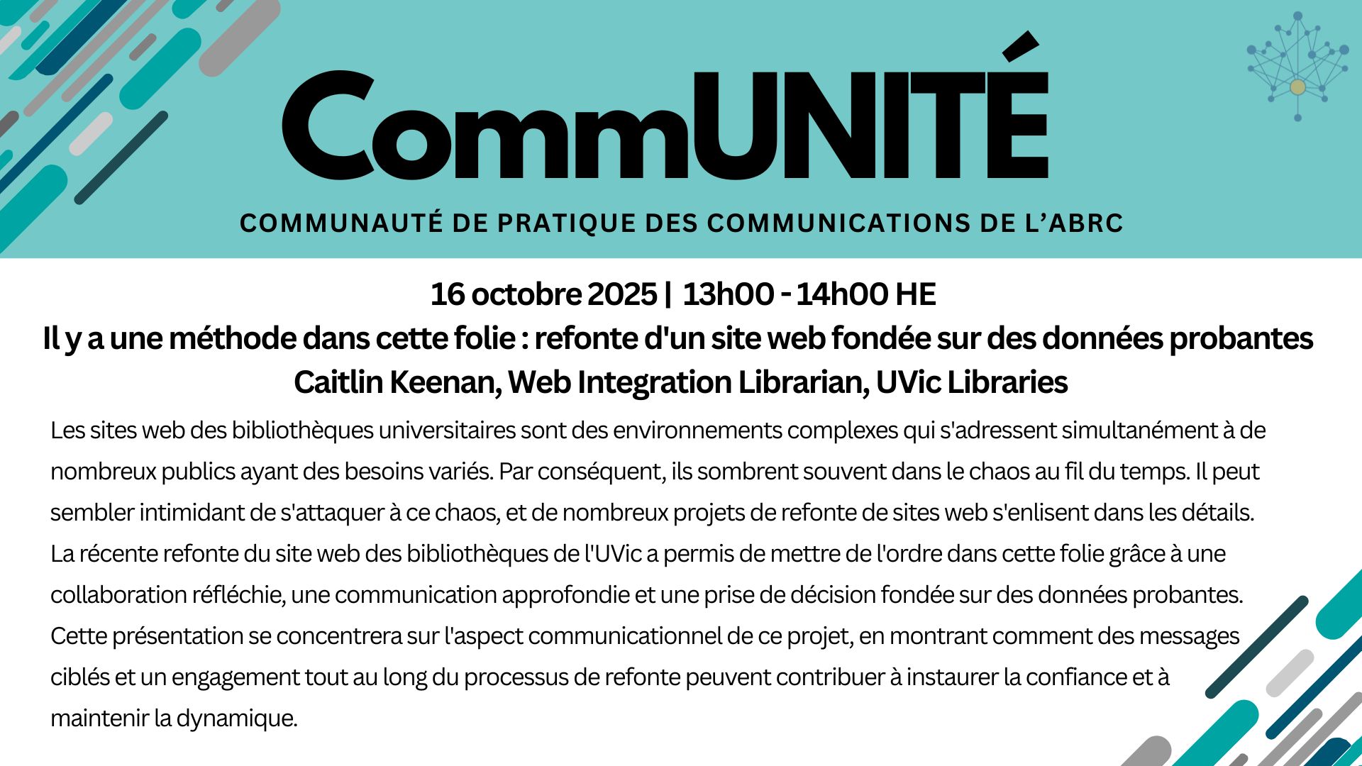 Les sites web des bibliothèques universitaires sont des environnements complexes qui s’adressent simultanément à de nombreux publics ayant des besoins variés. Par conséquent, ils sombrent souvent dans le chaos au fil du temps. Il peut sembler intimidant de s’attaquer à ce chaos, et de nombreux projets de refonte de sites web s’enlisent dans les détails. La récente refonte du site web des bibliothèques de l’UVic a permis de mettre de l’ordre dans cette folie grâce à une collaboration réfléchie, une communication approfondie et une prise de décision fondée sur des données probantes. Cette présentation se concentrera sur l’aspect communicationnel de ce projet, en montrant comment des messages ciblés et un engagement tout au long du processus de refonte peuvent contribuer à instaurer la confiance et à maintenir la dynamique.