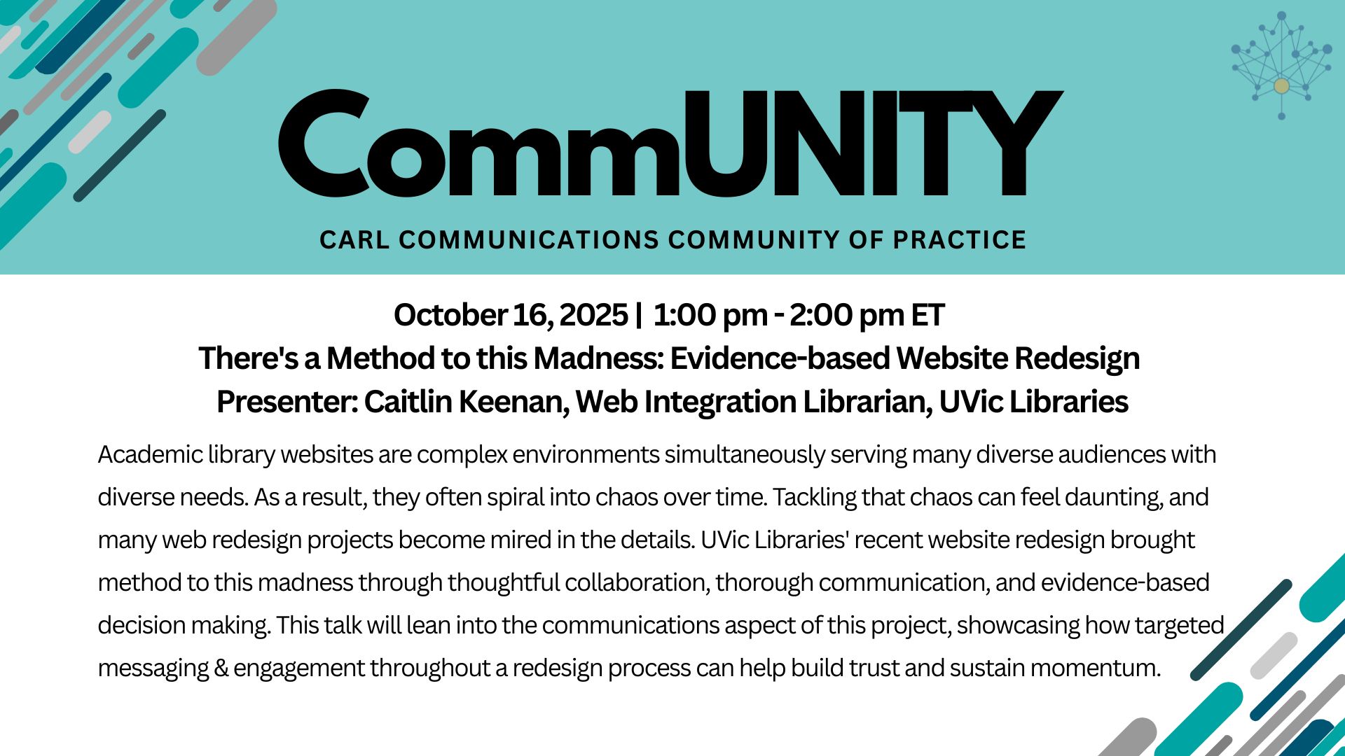 Communications Community of Practice October Call – There’s a Method to this Madness: Evidence-based Website Redesign at UVic Libraries